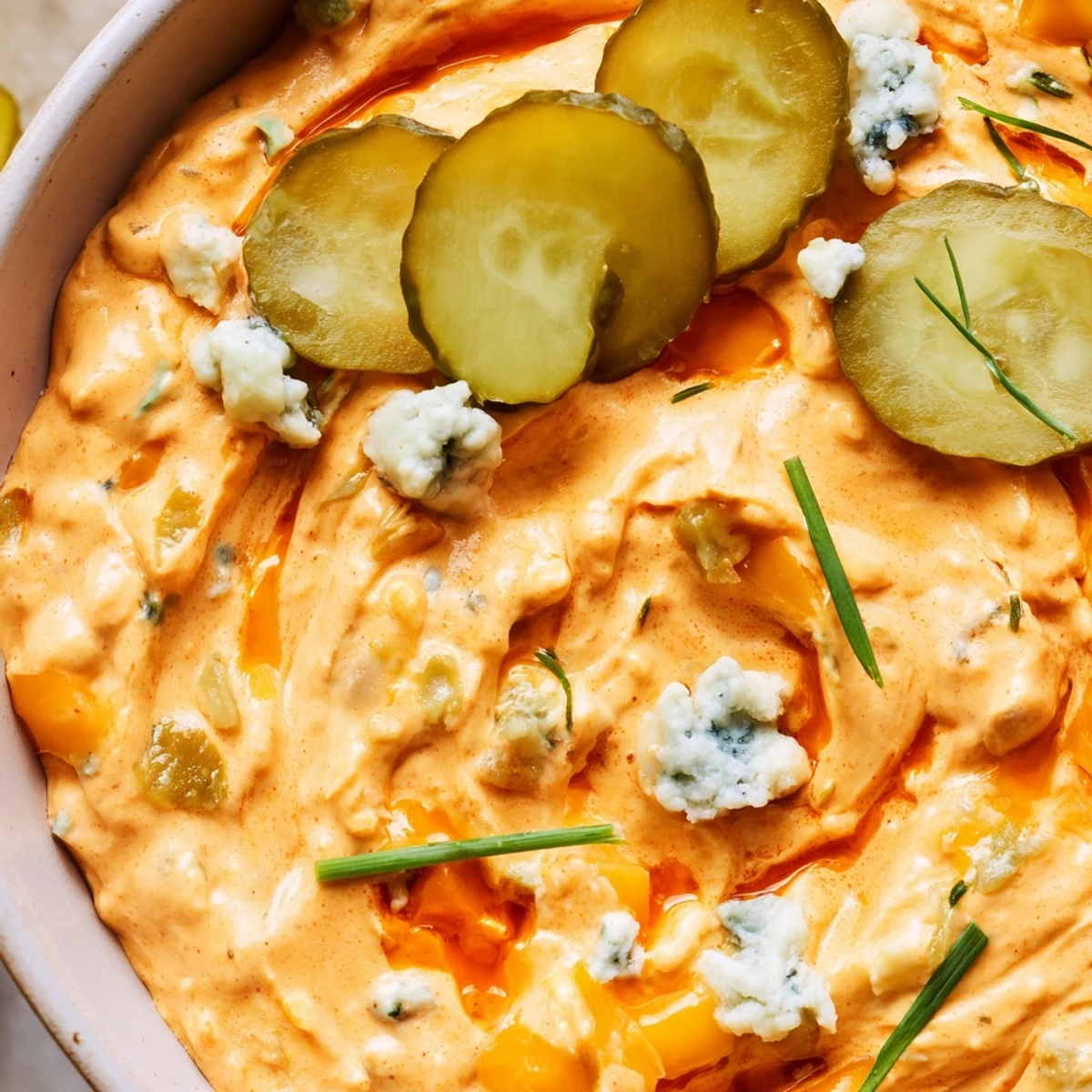 This zesty dip brings together the bold heat of buffalo sauce with the refreshing crunch of dill pickles. The creamy base blends softened cream cheese, sour cream, and mayonnaise for a velvety texture that coats every chip and veggie perfectly. Sharp cheddar adds depth, while crumbled blue cheese provides those signature tangy notes fans love. Fresh chives and garlic powder round out the flavor profile, creating a balanced appetizer that's neither too spicy nor too mild. Best of all, it comes together in just 10 minutes with no cooking required — simply mix, chill briefly if desired, and serve. The dip holds well for up to two days in the refrigerator, making it ideal for meal prep or make-ahead party planning.