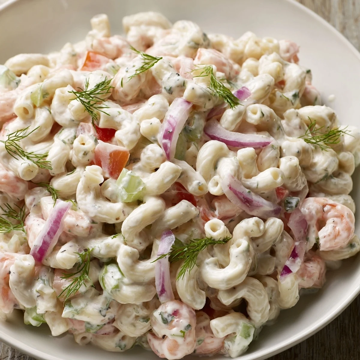 - Add the cooled macaroni, shrimp, celery, red bell pepper, red onion, and herbs to the bowl with the dressing, then gently fold until every piece is lightly coated