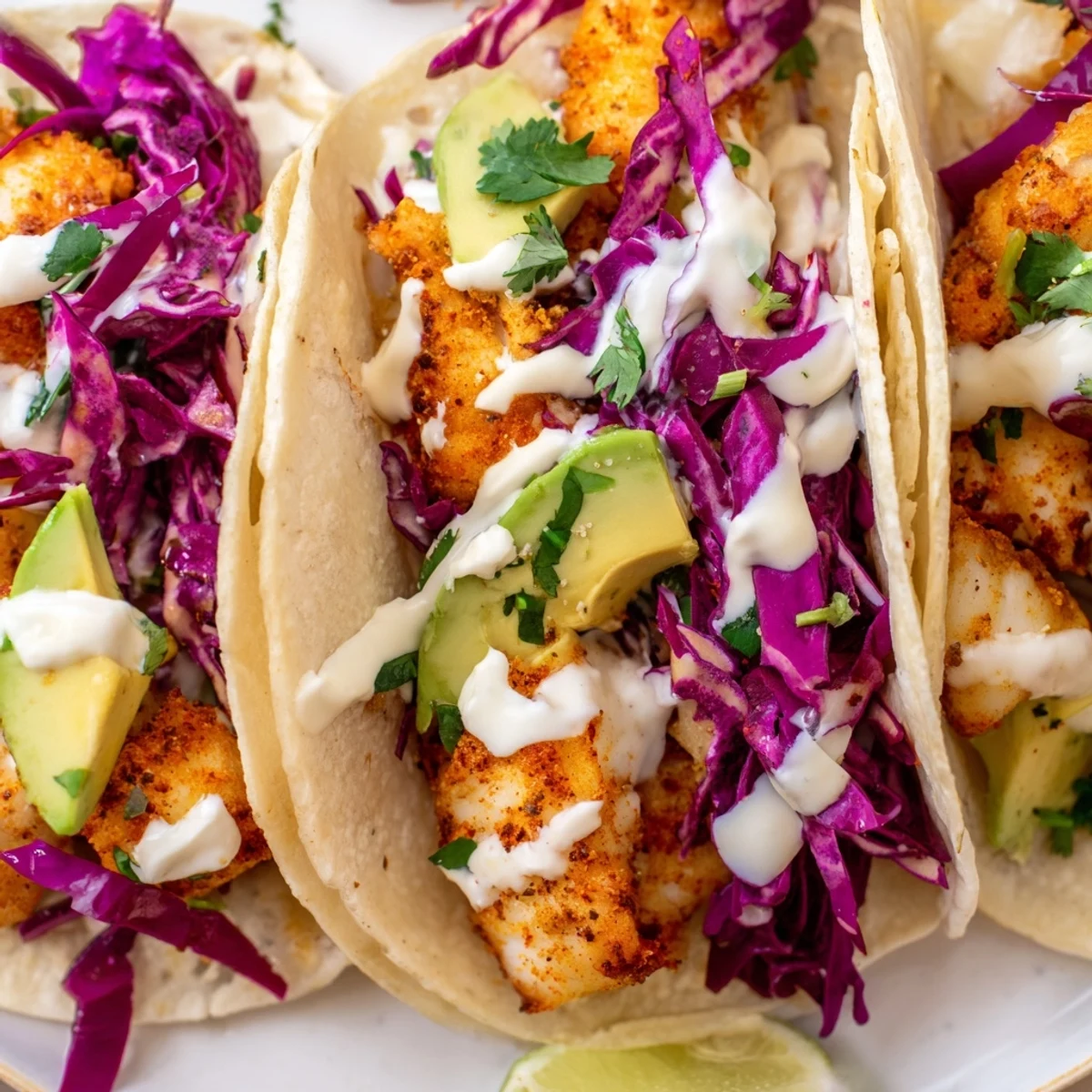 Swap the sour cream crema for dairy-free yogurt or make an avocado-based sauce by blending ripe avocado with lime juice, cilantro, and a splash of water. Use vegan-friendly tortillas and skip the cheese if serving. The fish and slaw are naturally dairy-free.